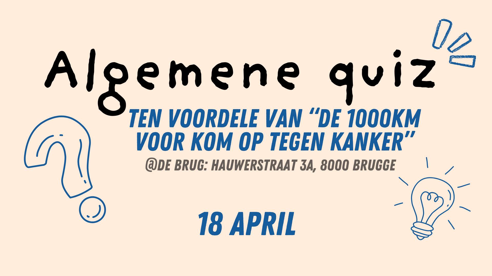 Op 18 april organiseren we deze actie voor Kom op tegen Kanker, een algemene quiz! Wij fietsen in mei met onze ploeg, Wieder Tegare, mee met de 1000km voor Kom op tegen Kanker en daarvoor moeten we een startbedrag van minimaal €5500 inzamelen om te kunnen deelnemen.