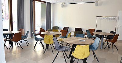 capaciteit: 20 personen aan 4 ronde tafels en 8 personen in loungezeteltjes; 40 personen in theateropstelling
